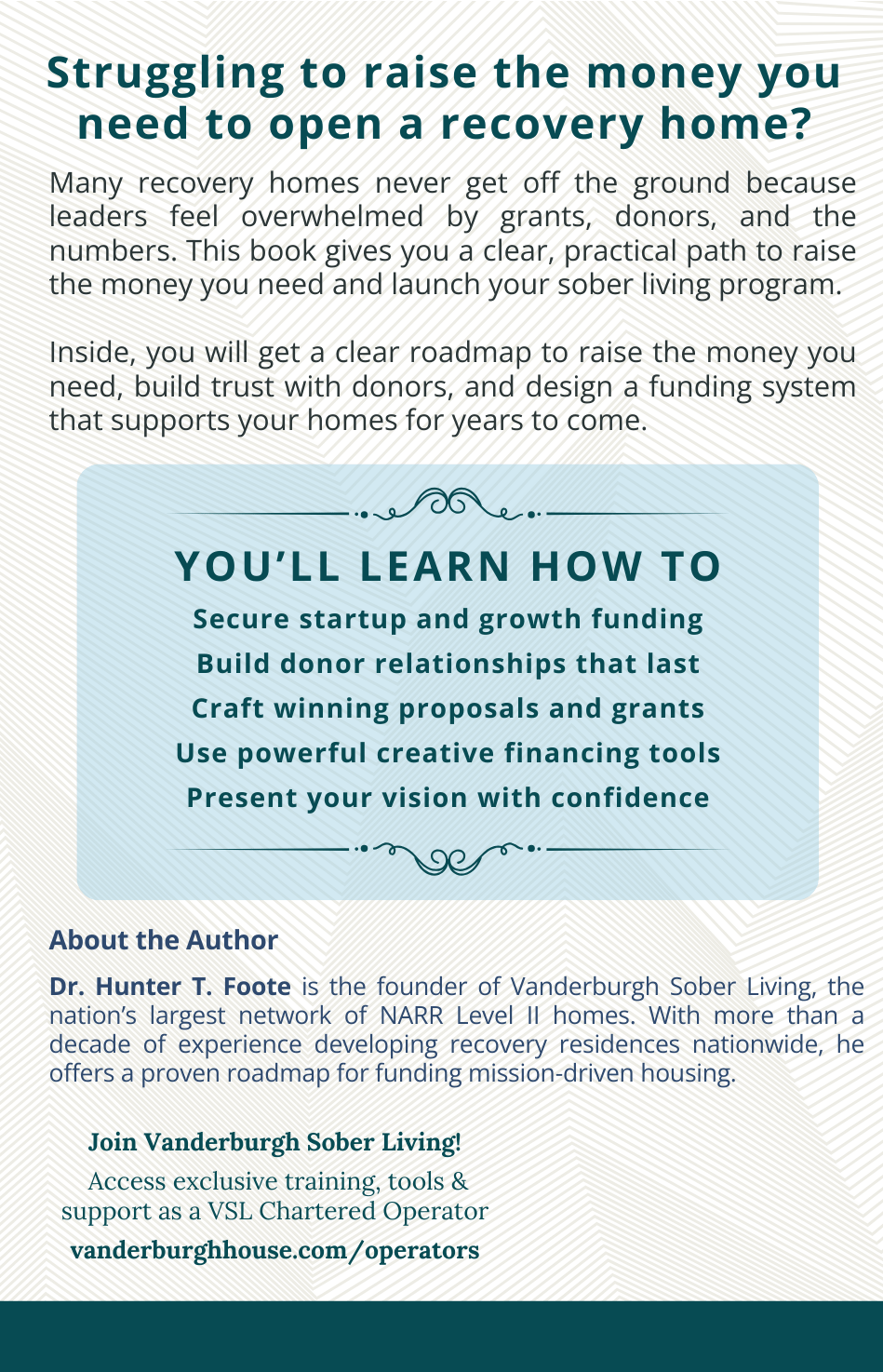 Funding recovery housing often requires more than rent alone. Recovery Home Fundraising Blueprint provides practical strategies for securing donors, grants, and creative financing. This book helps operators expand access to recovery housing while strengthening long-term sustainability.